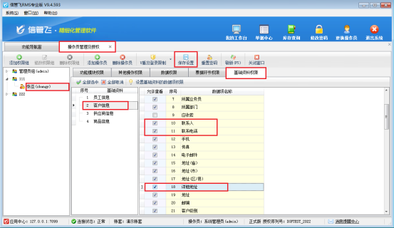 在功能導航窗點擊“系統管理”—》“操作員及授權”打開操作員管理及授權界面,選擇操作員賬號,在“基礎資料權限”界面將“客戶信息”權限勾選上聯系人、聯系電話、詳細地址等權限,然后保存權限設置,如圖所示:
