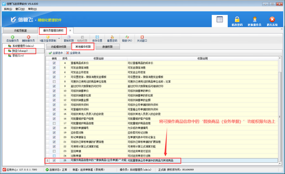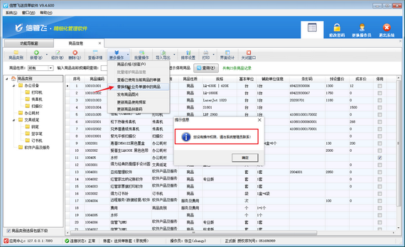 信管飛軟件支持設(shè)置多個(gè)操作員賬號并對操作員賬號設(shè)置權(quán)限,有用戶操作員賬號登錄送貨單軟件,在商品信息界面使用“替換相關(guān)業(yè)務(wù)單據(jù)中的商品”功能時(shí),系統(tǒng)會彈出提示信息“您沒有操作權(quán)限,請與系統(tǒng)管理員聯(lián)系!”,如下圖所示。
