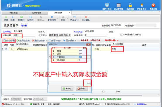多賬戶輸入與自動分配:在收款結算單界面,打開收款賬戶選項。在多資金賬戶中分別輸入實際收款金額。只需確保多個賬戶的收款金額相加等于本筆應收款金額,軟件便會自動進行分配,無需您手動計算與調整,大大提高了結算的準確性與效率。