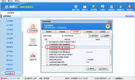 登錄軟件后,只需在功能導航窗中點擊“系統管理”,進入“系統參數配置”模塊,選擇“業務參數”選項卡,在“數據選擇參數”欄目中,勾選“在選擇商品窗口顯示客戶相關商品”參數,并點擊“保存”按鈕,配置即刻生效,無需重啟軟件即可立即體驗。