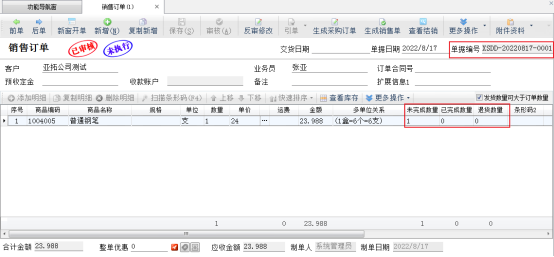 信管飛RMS軟件支持新開銷售出庫單引用銷售訂單,但是部分用戶在使用信管飛RMS軟件的過程中不知道銷售退貨單如何引用銷售訂單,下面具體介紹下信管飛RMS軟件退貨單中如何引用新增訂單? 首先先開一個銷售訂單,保存并審核,如下圖所示: 在功能導航窗點擊“系統管