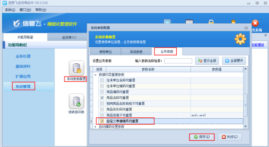 信管飛送貨單軟件支持設置商品擴展數值提取到單據擴展數值,啟用此參數后,在開單據時系統會自動調取商品信息中的擴展數值數據,省去了每次開單錄入單據擴展數值的時間,提高了開單效率。下面我們介紹一下具體的操作步驟。 在功能導航窗點擊“系統管理”—》“系統參數配置”—》“業務參數”打開業務參數配置界面,在“業務單據明細參數”內啟用參數