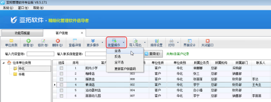 亞拓管理軟件、紅管家倉庫管理軟件、紅管家出納記賬軟件都包括對客戶信息和供應商信息的管理,紅管家票據打印軟件和紅管家送貨單軟件也包括對客戶信息的管理。客戶信息集中管理和維護客戶資料,供應商信息實現供應商資料的維護。在軟件中如何快速批量修改客戶或供應商單位類別呢?下面我們以亞拓管理軟件專業版為例詳細介紹下如何批量修改客戶單位類別。另外,批量修改供應商單位類別的方法