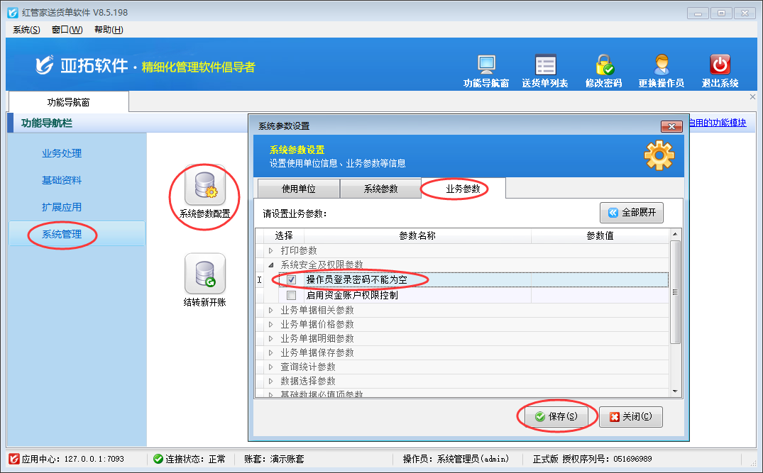 亞拓管理軟件、紅管家送貨單軟件、紅管家倉庫管理軟件、紅管家出納記賬軟件等軟件內都可以設置多個操作員,并可以設置操作員登陸密碼不能為空,本篇文章我們以紅管家送貨單軟件為例詳細介紹一下如何設置操作員登陸密碼不能為空? 在功能導航窗點擊“系統管理”→“系統參數設置”→“業務參數”可以打開“業務參數”配置界面,在系統安全及權限參數內