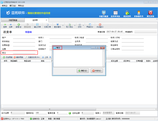 紅管家送貨單軟件、紅管家倉庫管理軟件和亞拓管理軟件單據中的擴展信息及備注等都可設置取值方式,都可以通過彈出窗口輸入的方式進行錄入信息。當錄入的備注或者擴展信息文本內容比較多時,由于界面有限,直接錄入窗口無法顯示全部的錄入信息,我們可以設置該數據項的取值方式為“彈出窗口輸入”,方便錄入更多的數據內容。 我們以送貨單軟件為例,示