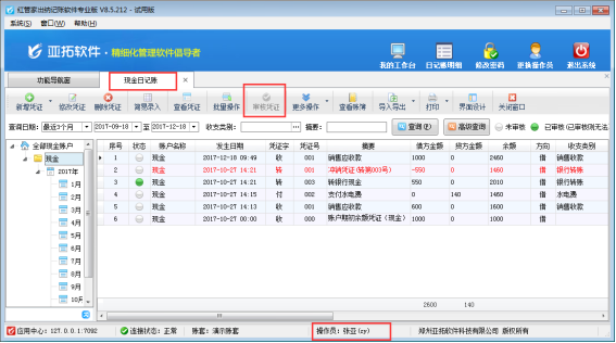 紅管家出納記賬軟件、亞拓管理軟件(標(biāo)準(zhǔn)版、專業(yè)版)有出納模塊,可以管理現(xiàn)金日記賬和銀行日記賬。鑒于許多用戶在出納管理有審核出納憑證人員,出納現(xiàn)金日記賬和銀行日記賬支持控制操作員的日記賬憑證的審核權(quán)限。 以紅管家出納記賬軟件專業(yè)版本為例,示范下如何取消操作員“張亞”的現(xiàn)金日記賬、銀行日記賬的可審核權(quán)限。