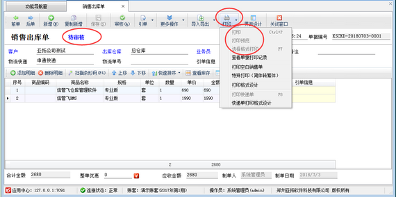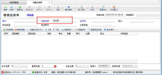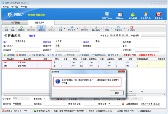 信管飛送貨單軟件、信管飛倉庫管理軟件、信管飛RMS等軟件在新開業(yè)務(wù)單據(jù)時默認在一個單據(jù)單據(jù)明細內(nèi)支持同一商品可添加多條記錄(如下圖一所示),部分用戶在開單時需要設(shè)置在單據(jù)明細中同一商品不可錄入多行?該如何設(shè)置呢?本篇文章我們以信管飛RMS為例來介紹一下如何設(shè)置開單時單據(jù)明細中同一商品不可錄入多行。圖一 銷售出庫單界面 在功能