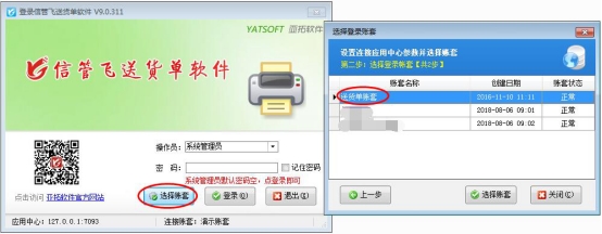 亞拓軟件旗下的信管飛RMS、信管飛倉庫管理軟件、信管飛送貨單軟件、信管飛出納記賬軟件、信管飛票據打印軟件等軟件程序安裝后會顯示兩個圖標,一個是應用中心程序(紅色圖標),一個是客戶端程序(藍色圖標)。這些軟件都含有賬套管理功能,在應用中心里面可以建立多個賬套,已使用的帳套如果不再繼續使用,可以停用帳套,停用帳套后,客戶端程序登錄時無法連接該帳套。我們以信管飛送貨