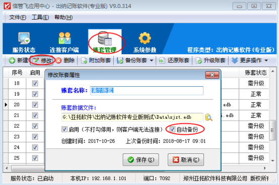 信管飛出納記賬軟件、信管飛送貨單軟件、信管飛RMS、信管飛倉庫管理軟件及信管飛票據軟件都支持設置賬套自動備份,我們強烈建議啟用自動備份功能,以便賬套出現問題的時候從賬套備份文件中恢復數據。下面我們以信管飛出納記賬軟件專業版為例詳細介紹一下如何啟用賬套自動備份功能? 首先打開軟件應用中心主界面,點擊“系