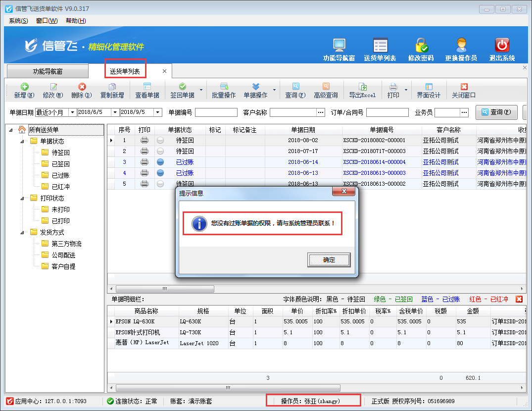 送貨單一般情況下是一式三聯(存根聯、客戶聯、回單聯),其中回單聯的作用是:在購買方收到商品核對完畢,與送貨單上的商品明細相符后,在回單聯上簽完名,由銷售方拿回,證明貨物已送達,買方確認已簽收。 信管飛送貨單軟件通過狀態控制實現簡單的流程管理(待簽回—》已簽回—》已結賬),本篇文章我們來介紹一下如何在軟件內設置操作員不可簽回、