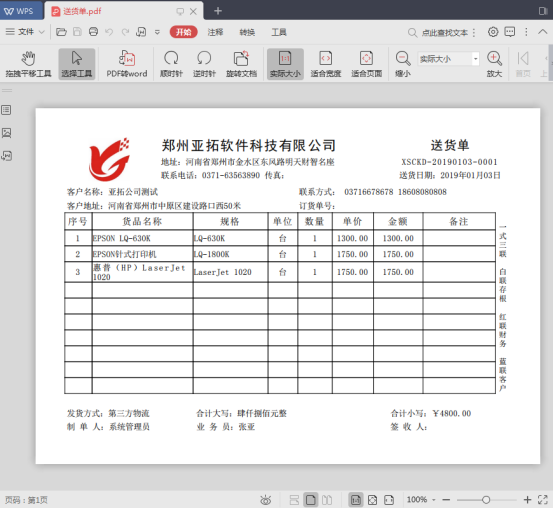 信管飛送貨單軟件、信管飛RMS、信管飛倉(cāng)庫(kù)管理軟件等都支持打印送貨單(銷售單),軟件支持把送貨單預(yù)覽界面導(dǎo)出到Excel文件、Html文件、Text文件及jpg、pdf等電子檔格式,方便用戶導(dǎo)出送貨單的電子檔給客戶看,方便客戶可以隨時(shí)查看送貨單內(nèi)容。下面我們以信管飛送貨單軟件為例講一下如何把送貨單預(yù)覽界面導(dǎo)出為pdf格式。
