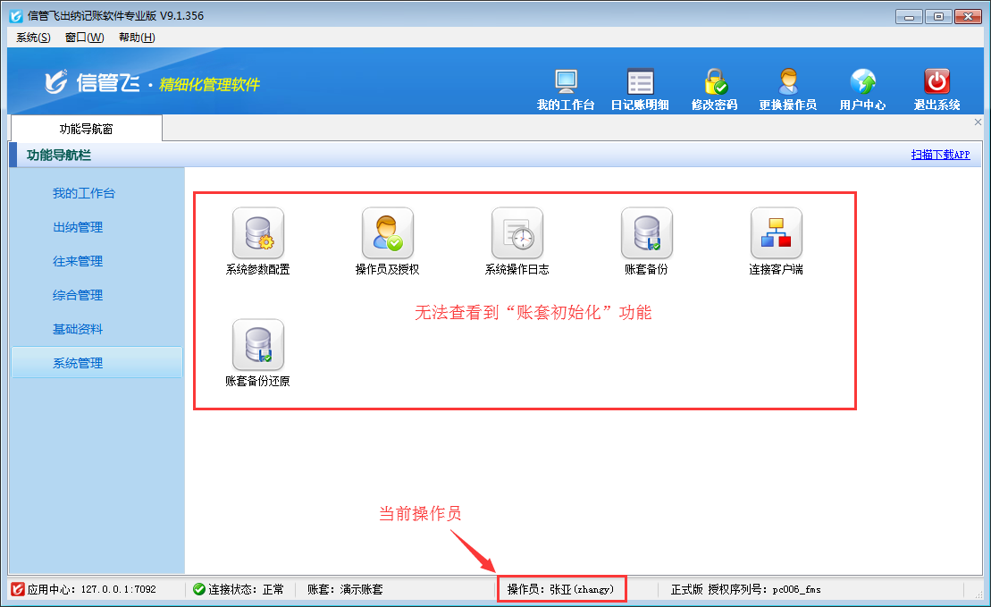 信管飛出納記賬軟件內(nèi)包含豐富的記賬統(tǒng)計(jì)表格,如現(xiàn)金賬簿、銀行賬簿、資金日(月)報(bào)表、收支類別匯總表等。如果不希望員工賬號(hào)登錄后查看到這些報(bào)表,如何設(shè)置呢?本篇文章以信管飛出納記賬軟件專業(yè)版為例演示一下出納記賬軟件內(nèi)如何設(shè)置操作員不可查看現(xiàn)金及銀行賬簿。 登錄軟件,在功能導(dǎo)航窗點(diǎn)擊“系統(tǒng)管理”—》“操作員及授權(quán)”,進(jìn)入“操作員