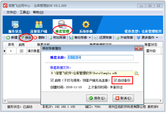 信管飛送貨單軟件、信管飛RMS、信管飛出納記賬軟件、信管飛倉庫管理軟件及信管飛票據軟件都支持設置賬套自動備份,我們強烈建議啟用自動備份功能,以便賬套出現問題的時候從賬套備份文件中恢復數據。下面我們以信管飛倉庫管理軟件為例詳細介紹一下如何啟用賬套自動備份功能? 首先打開軟件應用中心主界面,點擊“系統參數”—》“賬套備份參數”,