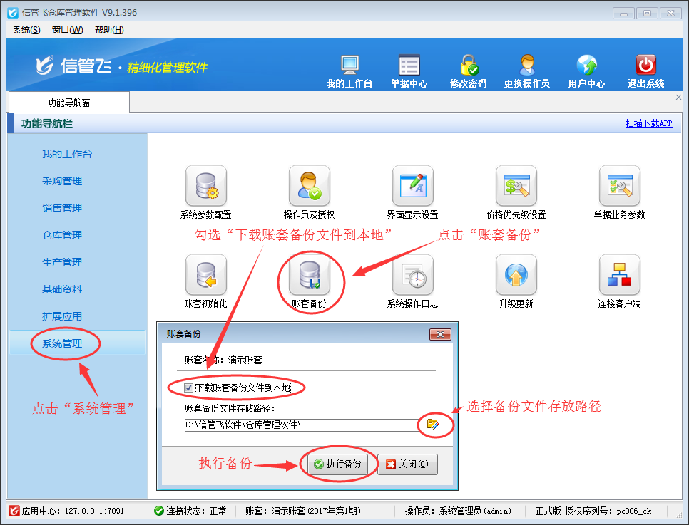 信管飛倉庫管理軟件、信管飛出納記賬軟件、信管飛送貨單軟件、信管飛RMS等軟件賬套數據默認存儲在軟件安裝目錄下,支持對賬套數據進行備份,如需要更換主機電腦,需要在原來的主機電腦上備份賬套數據,將生成的備份文件復制到新的主機電腦上,然后在新的主機電腦上安裝軟件,使用備份文件還原數據即可。 以信管飛倉庫管理軟件為例,演示一下更換電