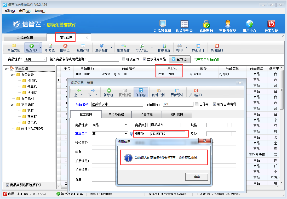 信管飛送貨單軟件支持通過掃描條形碼添加商品到單據明細進行快速開單,如開單需要使用掃描條形碼功能,需要提前在基礎資料—》商品信息中將每個商品的條形碼信息維護好,為了避免商品條形碼錄入重復,軟件支持參數設置商品條形碼不可重復,本文介紹一下如何設置商品條形碼不可重復。 在系統管理—》系統參數配置—》業務參數內將“數據可否