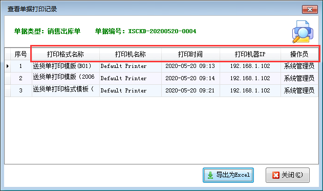 進銷存管理軟件支持自定義打印格式模板,可選擇不同打印模板進行打印單據,也可根據參數設置限制單據打印次數,跟蹤記錄單據每次打印情況,本篇文章介紹一下如何查看單據打印記錄? 在銷售出庫單界面工具欄點擊“打印”—》“查看單據打印記錄”可以打開查看單據打印記錄界面,如下圖所示,可以查看本單打印記錄,跟蹤記錄單據每次打印情況,如每次打