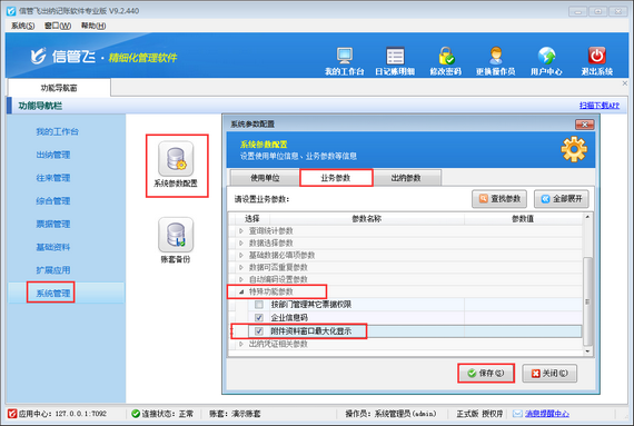 信管飛送貨單軟件支持多窗口同時開單,軟件默認同時只能填開一張送貨單,如果單據(jù)比較多,需要同時填開多張送貨單的情況下,可以根據(jù)本文介紹進行參數(shù)配置,示例如下: 在功能導航窗點擊“系統(tǒng)管理”—》“系統(tǒng)參數(shù)配置”—》“業(yè)務參數(shù)”打開業(yè)務參數(shù)配置界面,然后在業(yè)務單據(jù)相關參數(shù)內,勾選啟用“銷售單允許多窗口開單”參數(shù),并設置下參數(shù)值(同