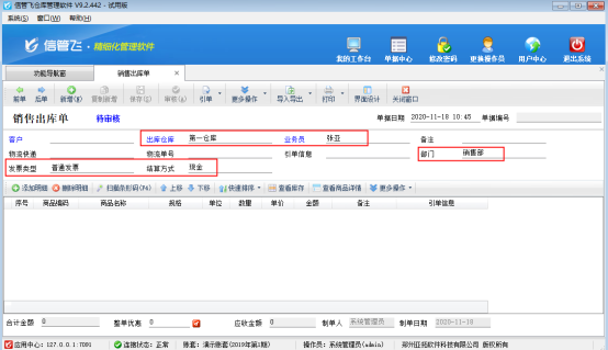 在企業(yè)的經(jīng)營管理過程中,為了快速開單,提高效率,有時需要對單據(jù)設置默認值。 信管飛倉庫管理軟件業(yè)務單據(jù)的界面分為單據(jù)主體及單據(jù)明細兩部分,如圖1所示,單據(jù)默認值功能是對單據(jù)主體的部分數(shù)據(jù)項進行設置默認值,業(yè)務單據(jù)設置默認值后,每次新增單據(jù)時會顯示已設置的數(shù)據(jù)項默認值。圖 1 下面我們以信管
