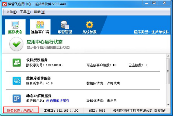 信管飛系列軟件,采用先進的多層技術體系架構,程序運行安全、穩(wěn)定、高效。客戶端程序與服務器端程序(即“信管飛軟件應用中心”程序)進行通訊,需要設置通訊端口,有用戶打開應用中心程序的時候提示服務狀態(tài)未啟動(如下圖),軟件無法登錄,這種是端口被占用導致,解決方法如下 打開應用中心程序,點擊“系統(tǒng)參數(shù)”,在基本