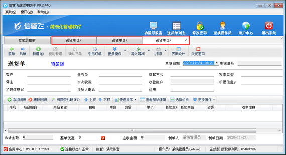 信管飛送貨單軟件、信管飛RMS、信管飛倉庫管理軟件等都支持打印銷售單(送貨單),軟件中內置的有十幾種打印模板,內置打印模板的打印抬頭信息自動調取系統(tǒng)管理中“系統(tǒng)參數(shù)配置”界面的使用單位信息。對于自定義設計的打印模板,也支持直接在打印模板中輸入公司的抬頭信息。以上軟件都可以免費下載試用,有些客戶試用軟件時需要修改打印抬頭信息,下面我們以信管飛送貨單軟件為例,介紹