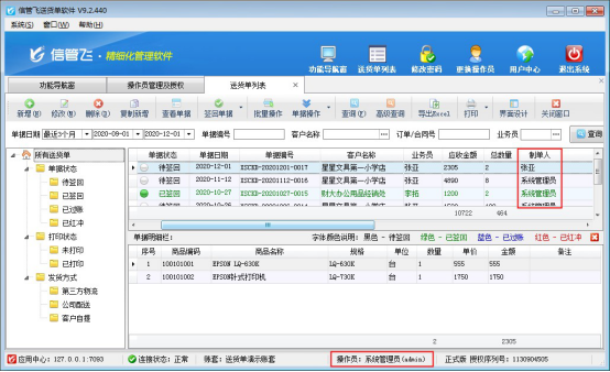 信管飛送貨單軟件支持設置多個操作員登錄軟件,為避免不同操作員登錄軟件查看其他人單據(jù),軟件支持設置操作員權限,只能查看自己的開單單據(jù),以“送貨單”為例,示范下如何設置操作員只能查看自己的單據(jù)。 功能導航窗點擊“系統(tǒng)管理”—》“操作員及授權”進入操作員管理及授權界面。添加操作員“張亞”,添加后選擇此操作員