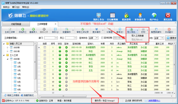 信管飛出納記賬軟件專業版包括工資管理功能,支持自定義工資模板管理員工工資單,可根據設置的工資模板快速生成工資單,支持從上月工資單復制工資項目數據。為了避免操作員導出工資單,軟件中可以設置操作員不可導出工資記錄權限。下邊我們在軟件中示范下設置操作員不可導出工資記錄權限的操作步驟。 登錄軟件,在功能導航窗點擊“系統管理”—》“操