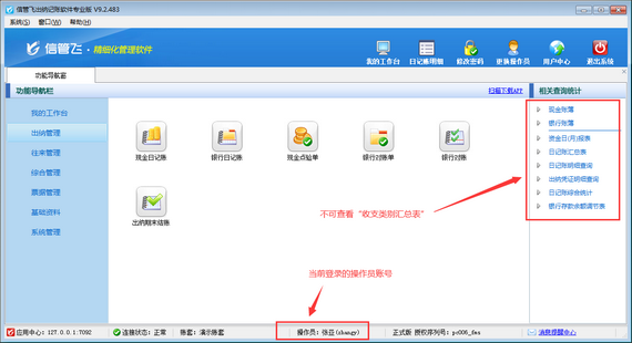 信管飛出納記賬軟件內(nèi)包含豐富的記賬統(tǒng)計報表,如現(xiàn)金賬簿、銀行賬簿、資金日(月)報表、收支類別匯總表等。如果不希望員工賬號登錄后查看到這些報表,如何設(shè)置呢?本篇文章以信管飛出納記賬軟件專業(yè)版為例演示一下出納記賬軟件內(nèi)如何設(shè)置操作員不可查看收支類別匯總表? 登錄軟件,在功能導(dǎo)航窗點擊“系統(tǒng)管理”—》“操作員及授權(quán)”,進(jìn)入“操作員